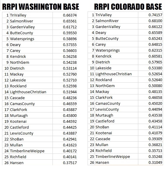 Here's a look at how the Class 1AD2 RRPI Washington base rankings (left) and the Class 1AD2 RRPI Colorado base rankings (right) looked at the completion of the regular season:
