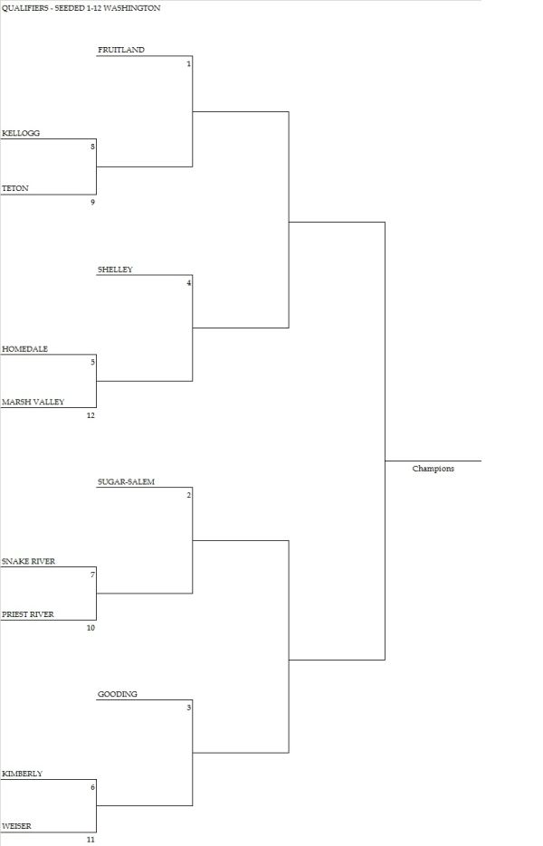 A few things change in comparison to the actual, real bracket used for this year's tournament. Kellogg would lose their first round bye, but would host their first round playoff game against Teton. Marsh Valley would travel to Homedale, and Priest River would take the long trip through Montana to eastern Idaho to face Snake River. Kimberly and Weiser would still play in the first round. Fruitland and Shelley would both get first round byes and be on the same side of the bracket, while Sugar-Salem and Gooding would do likewise.