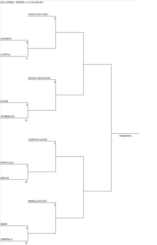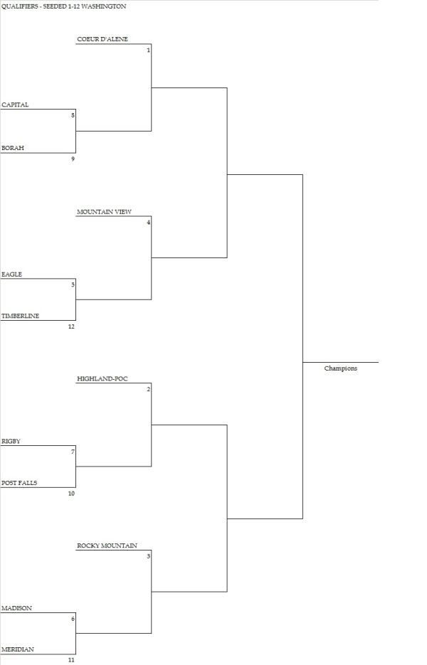 In this bracket, Timberline and Meridian are replaced with Hillcrest and Lewiston. Madison and Capital play once again as does Post Falls and Borah. Eagle would face Lewiston with Rigby taking on Hillcrest. You would get two Treasure Valley teams with byes to the quarterfinal round on the top of the bracket (Mountain View and Rocky Mountain) while two longtime rivals would also reach the quarterfinals via the bye (Highland and Coeur d'Alene).