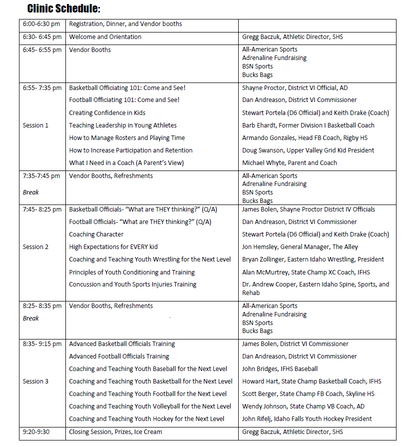 On Jan. 28, 2019 youth sports directors, middle and high school AD’s, and sports official commissioners met to discuss the climate of youth sports in Eastern Idaho. Concerns of referee shortages, sportsmanship, and negative parent/coach interactions (locally and nationwide) inspired this first-ever coaching clinic offered to all who are involved in youth sports in Eastern Idaho. Endorsed by the Idaho High School Activities Association, this clinic will offer general coaching and officiating sessions as well as sport-specific training including football, basketball, baseball, volleyball, hockey, and wrestling. The hope is that this clinic will be a catalyst to addressing positive sportsmanship in our area and provide valuable training for youth sport volunteers who do not currently receive training.