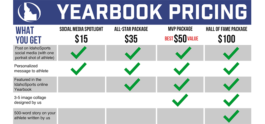 - Full feature story, about your athlete, written by a professional IdahoSports.com staff writer (500+ words) and featured on the IdahoSports.com Yearbook page.