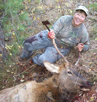 Only two minutes after Penny left, an elk came up just below where she had been sitting. I looked at it with my binoculars, but it was about 850 yards away, and I couldn't see any horns. Instead of texting her, I called her on her cell and told her to go back to where she was. Some people think that ground to ground communication is illegal in hunting, but it is not. Air to ground is the communication that is illegal.