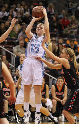 As a team, what are your offensive strengths? Jacey is our outside strength along with Addie, Nicki, Mesa. Inside we have Alex, Katee, Lizzy, Caitlyn, which are all great threats inside. As a team we have a great work ethic.