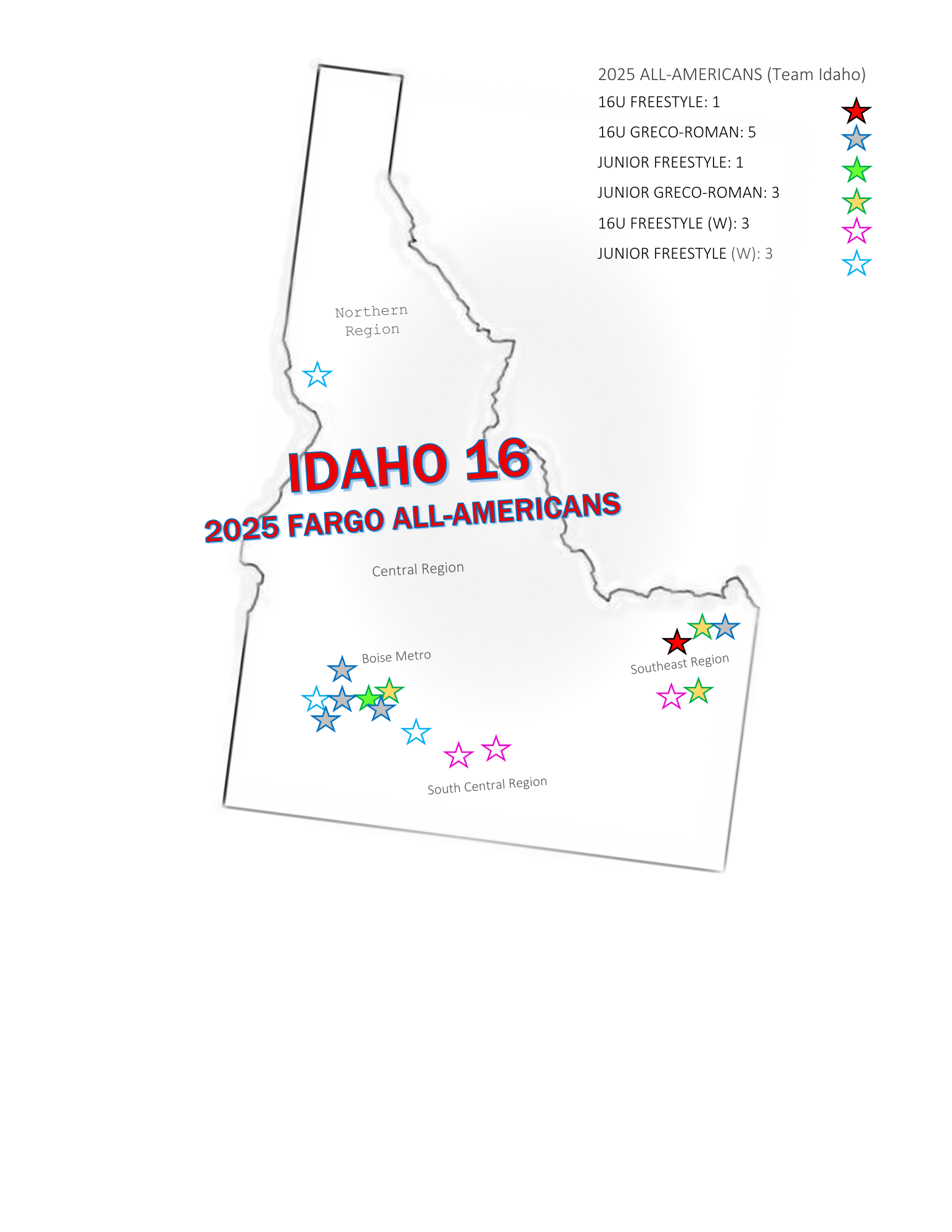 Below is a list of 2025 All-Americans per division and Fargo statistics dating back to 1980. A huge “THANK YOU” to Jason Bryant, one of the top journalists and promoters of wrestling in the country for his hard work and commitment to compile the entire history of the Fargo National Championships. Accordingly, I would not have been able to accurately compile Idaho’s history without having access to his work. WE’RE ONE IDAHO!