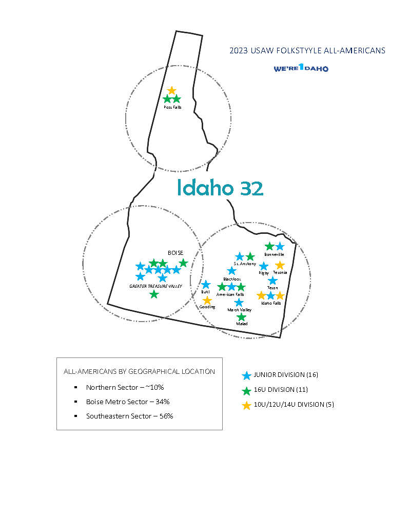 The remaining Gem State wrestlers to place in the top 8 include 2022 Folkstyle All-American Koy Orr (Buhl), 5A State Champion Nikko Gonzalez (Nampa), Akio Sanders (Nampa), the Guerra brothers, Guiseppe and Jen-Luc of Mountain View, State Champion Kolby Clark (South Fremont, and Aden McGinnis (Mountain View), who in 2022 earned All-American honors at the USAW Folkstyle Nationals.