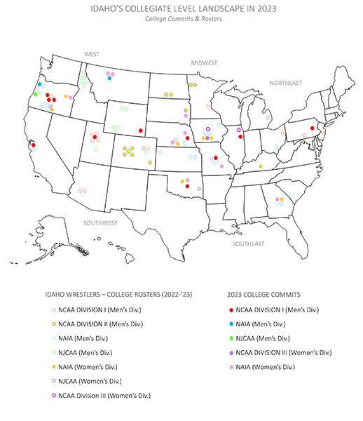 There are many more examples throughout Idaho and if any young wrestler at the grassroots or high school levels has the dream of competing at the highest levels, it’s possible in the Gem State. The proof is in the results, wrestling culture, and number of wrestlers committing to or now competing at the next level (See diagram).