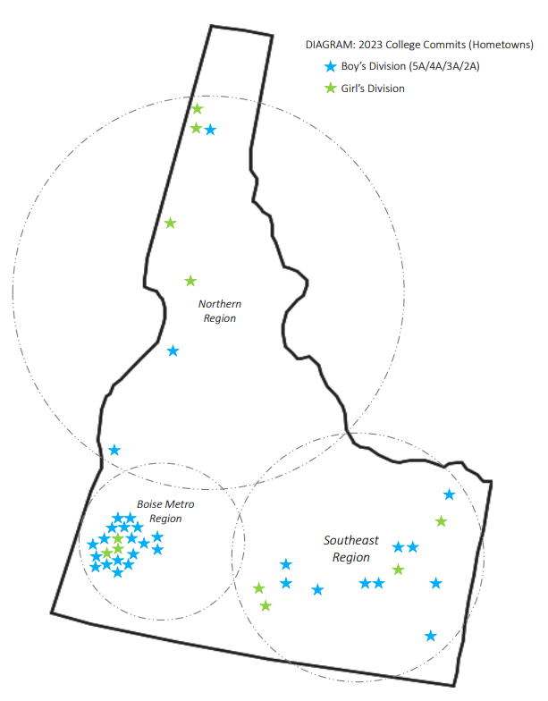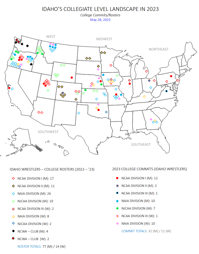 Below is a list of Idaho wrestlers/accolades, who have recently committed to compete at the collegiate level in 2023 (new additions highlighted in blue). This group of 43 commits is represented in the three regions of Idaho (see diagram 2023 College Commits – Hometowns); Boise Metro (51%), Northern (16%), and Southeast (33%). Additionally, I reviewed every college level roster from each of the five divisions, NCWA Club teams (via the NWCA site), and provide a tally of all the Idaho wrestlers listed during the 2022 – ’23 season. On top of that, I compiled a long list of historical collegiate level All-Americans from Idaho dating back to the early 1960s (All divisions). If I have missed anyone, please bring this information to my attention by emailing brandon@idahosports.com.